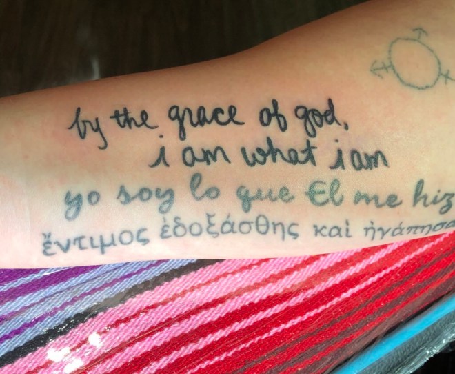 Today, I finished a piece of tattoo work that I started during my time in the church. I had decided years ago to get biblical identity statements tattooed on my arm to remind me that no matter how I saw myself, I was loved and worthwhile. Last year, I added a symbol to reflect my identity as a trans person. Today, I put the following statement — “by the grace of god, i am what i am.”